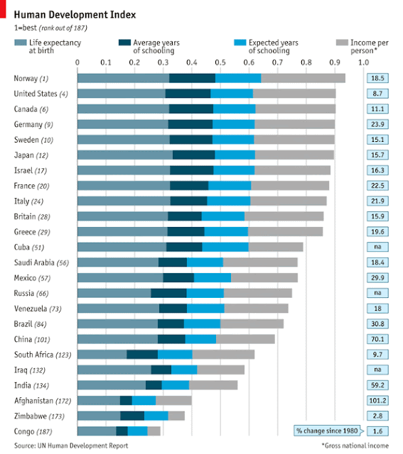 This is a weighted mix of measurements that shows life expectancy, knowledge (adult literacy and education including years of schooling) and standard of living (GDP per capita). As each economy is ranked against these 3 measurements, it then gets put into a index with 1 being the best and 0 being the worst. This allows the index to be set out like a league table with four divisions; very high human development, high human development. medium high human development and low high human development.